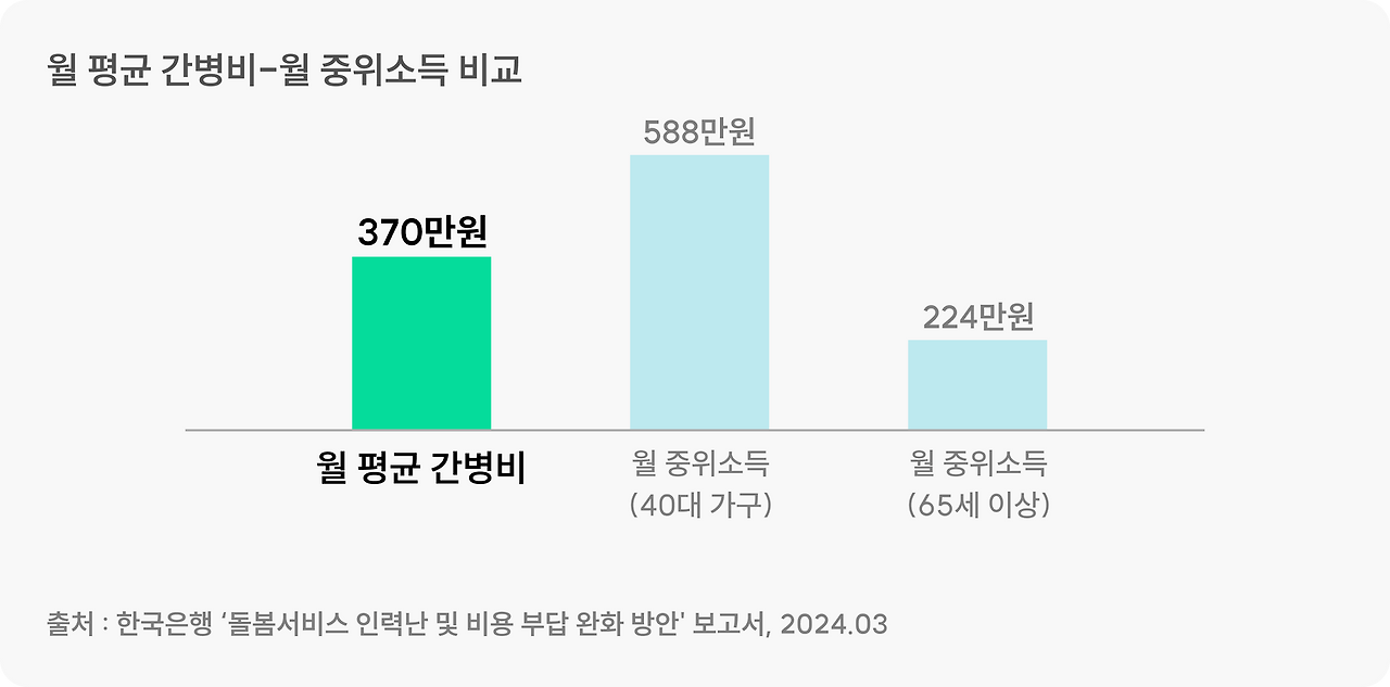 최근 통계에 따르면, 평균 간병 비용은 약 370,000원이지만, 40대의 평균 소득은 588,000원으로, 간병 비용과 소득 간의 격차가 크다는 것을 알 수 있습니다.