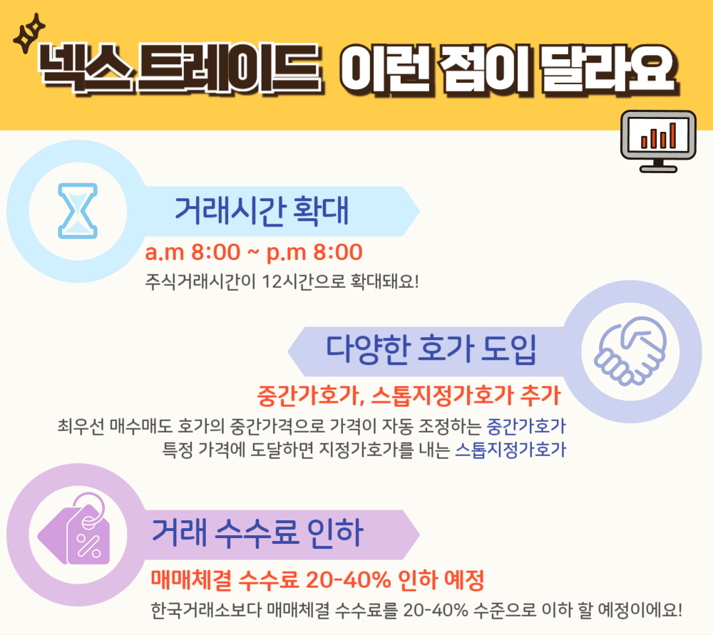 넥스트레이드는 대체거래소의 대표적인 예로, 기존의 거래소와는 다른 여러 가지 장점을 가지고 있어요. 가장 큰 특징은 거래 시간이 오전 8시부터 오후 8시까지로 늘어난 점이에요. 이는 투자자들이 더 많은 시간 동안 거래를 할 수 있도록 해주죠. 또한, 다양한 지원 옵션이 마련되어 있어 중간 및 스톱 리미트 주문을 통해 보다 유연한 거래가 가능해요. 예상 거래 수수료는 기존 거래소보다 20%에서 40% 정도 낮을 것으로 보이네요.
