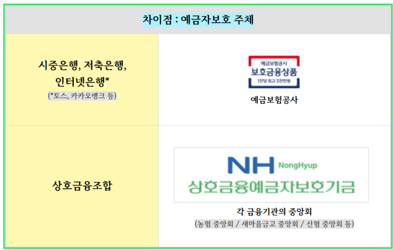 한국의 금융기관 비교와 예금 보호에 대한 정보입니다.