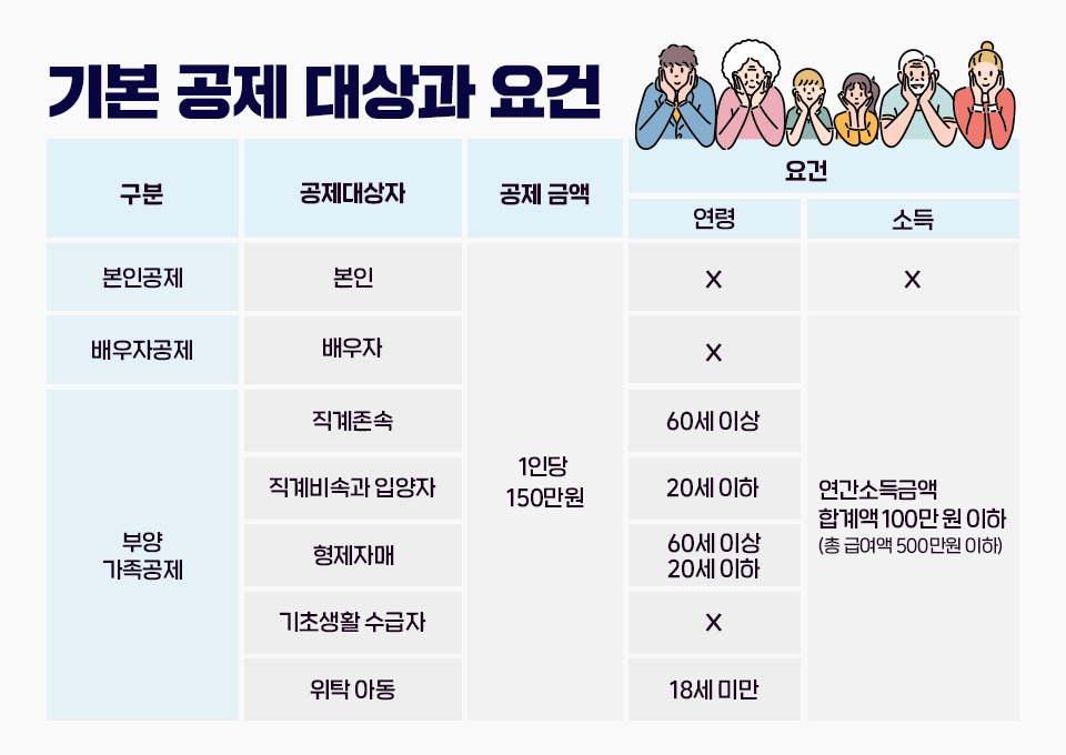 - 소득이 100만 원을 초과하면 인적공제를 받을 수 없어요.