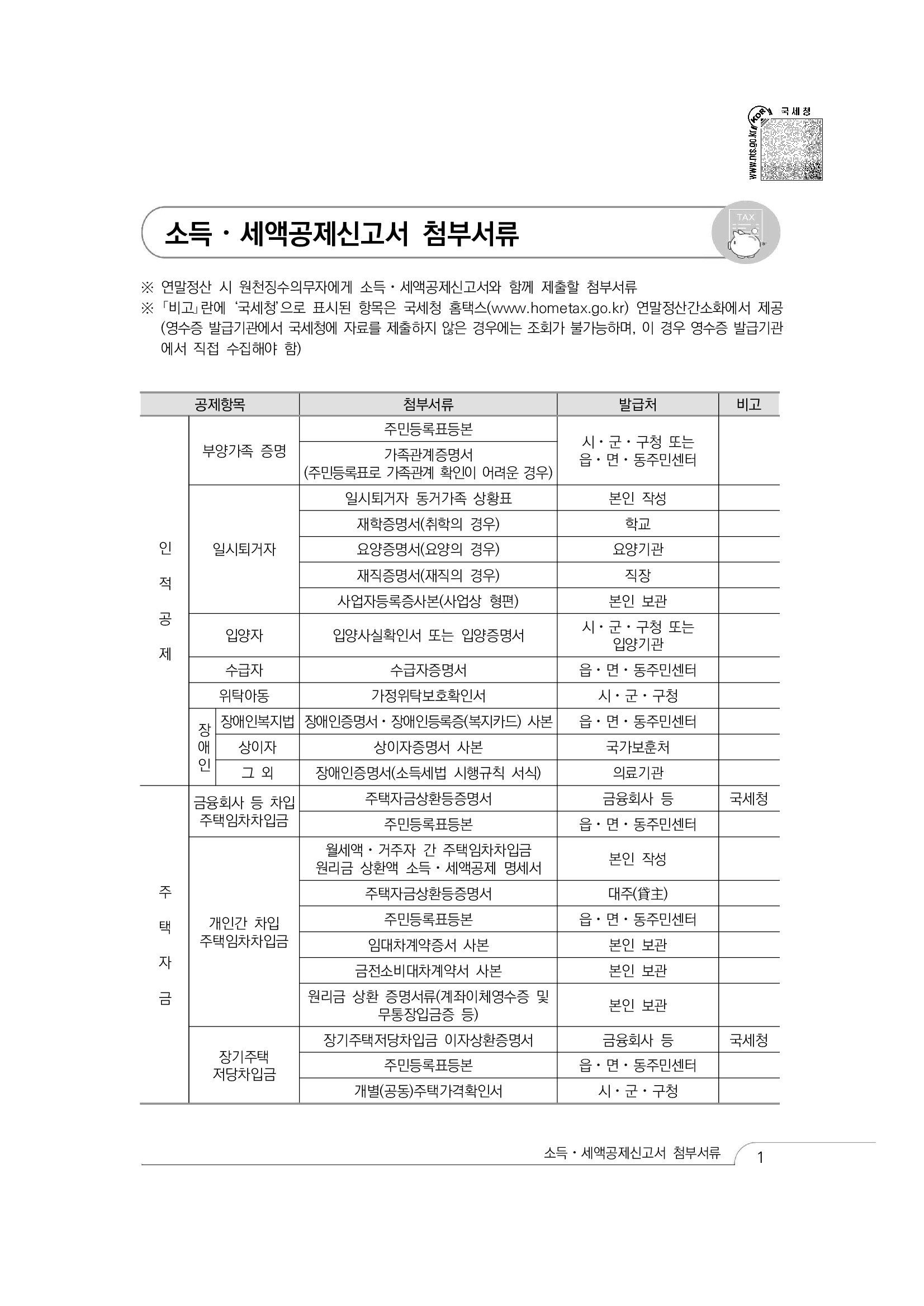 이 이미지는 소득·세액공제신고서에 필요한 첨부서류를 정리한 문서예요. 가족관계증명서, 소득증명서, 의료비 영수증 등 다양한 서류가 필요하니 미리 준비해두는 것이 좋아요. 특히, 공제 항목에 따라 필요한 서류가 다를 수 있으니, 각 항목에 맞는 서류를 체크리스트로 만들어두면 편리해요.