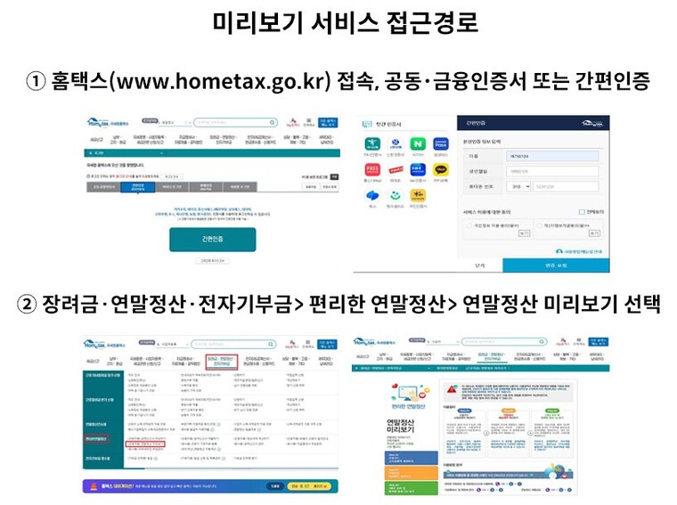 이 이미지는 홈택스에서 미리보기 서비스를 이용하는 방법을 보여주고 있어요. 로그인 후 "장려금·연말정산·전자기부금" 메뉴를 선택하고 "편리한 연말정산"을 클릭하면 미리보기 옵션에 접근할 수 있어요.