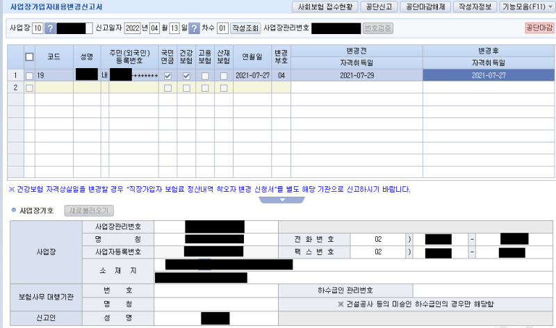 사업장 변경 신고서 양식입니다. 국민연금, 건강보험 및 고용보험과 관련된 정보를 담고 있습니다.