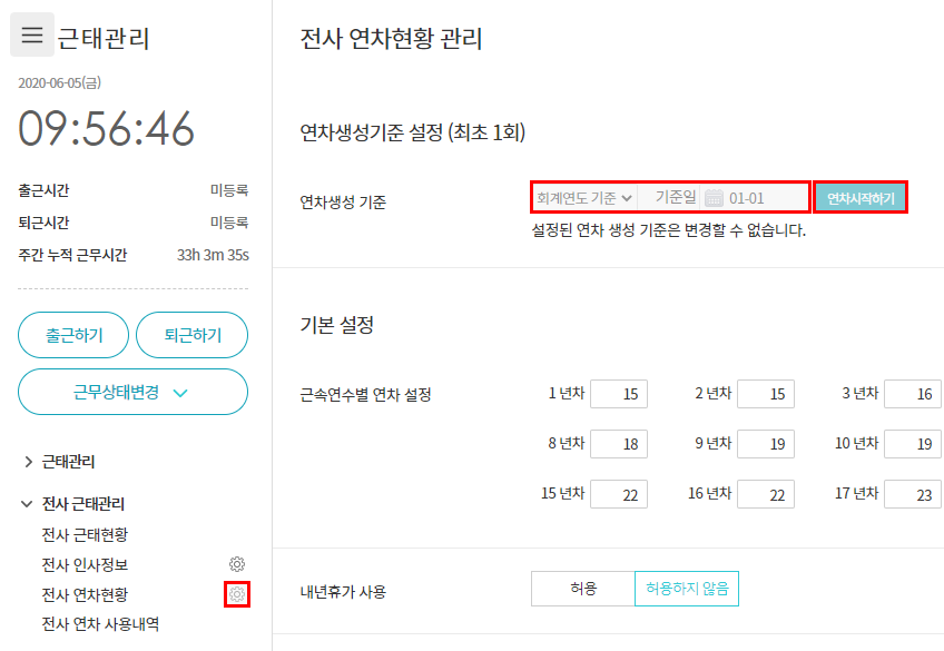 출근 및 휴가 관리 시스템의 사용자 인터페이스입니다. 연차 기준을 설정하고 출근 기록을 관리할 수 있는 기능을 보여줍니다.