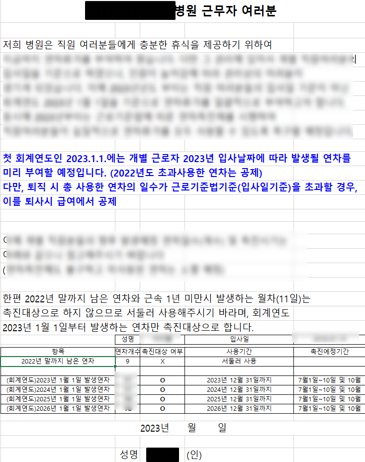 회사의 연차 휴가 정책 문서입니다. 2023년 연차 휴가의 사용 및 적립 기준을 안내하고 있습니다.