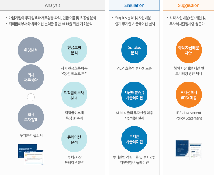 ALM의 주요 구성 요소는 크게 세 가지로 나눌 수 있어요. 첫째, 분석 단계에서는 환경 분석, 회사의 재무 상태, 투자 전략 등을 평가해요. 둘째, 시뮬레이션 단계에서는 잉여 분석과 자산 배분 시뮬레이션을 통해 다양한 시나리오를 검토해요. 마지막으로, 제안 단계에서는 최적의 자산 배분 추천과 투자 정책 성명서(IPS)를 제공해요. 이러한 구성 요소들은 ALM의 효과적인 실행을 위해 필수적이에요.