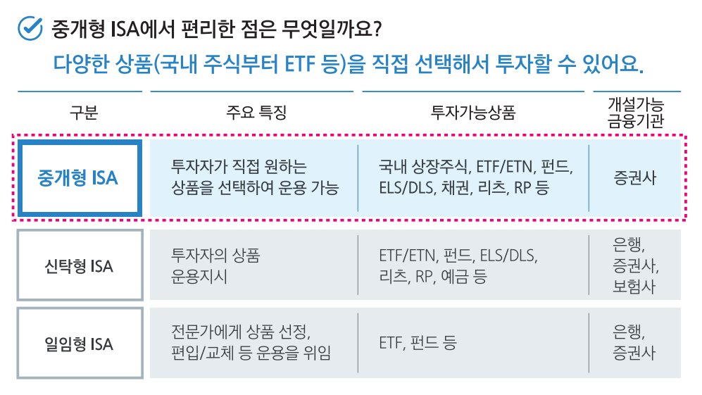 ISA 계좌는 크게 중개형 ISA, 신탁형 ISA, 일임형 ISA로 나눌 수 있어요. 중개형 ISA는 투자자가 직접 상품을 선택할 수 있는 유연한 옵션으로, 주식, ETF 등 다양한 금융 상품에 투자할 수 있어요. 신탁형 ISA는 금융기관이 관리하는 형태로, 투자자가 직접 관리하지 않아도 되는 장점이 있죠. 일임형 ISA는 전문가에게 투자 관리를 맡기는 형태로, 투자에 대한 부담을 줄일 수 있어요.